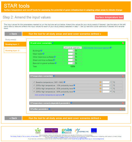 - STAR Tools. Surface Temperature and Runoff Tools for Assessing the Potential of Green Infrastructure in Adapting Urban Areas to Climate Change. 2016. Available online: http://maps.merseyforest.org.uk/grabs/- (accessed on 5 October 2017).
