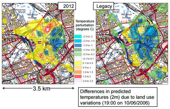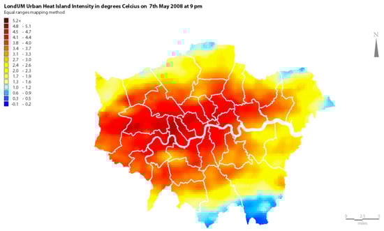Kershaw et al., 2010 estimated the heat island effect in the UK cities. The obtained results showed that the UHIs are largest in the summer, but not for every city. For example, in small cities such as Leicester or York, the UHIs are very small and do not vary with season. The annual average UHIs for different UK cities range between 0.1 and 1.9 °C, whereas in a summer period between 0.1 and 2.0 °C, for example, in London it varies between 1.6 and 1.9 °C for summer []. In London, since the 60’s the nocturnal UHI in spring and summer has increased approximately 0.12 °C/decade. The projections foresee a further increase of 0.26 °C by 2080 [].