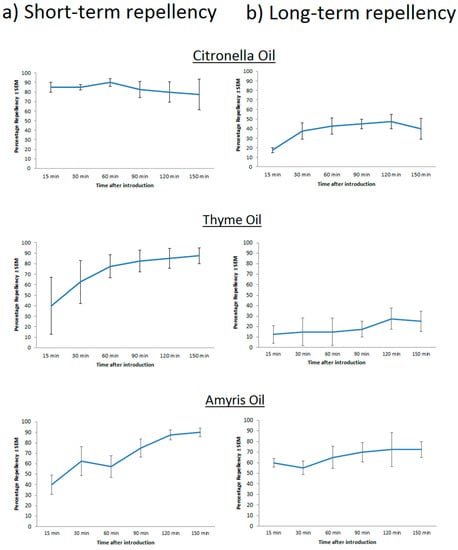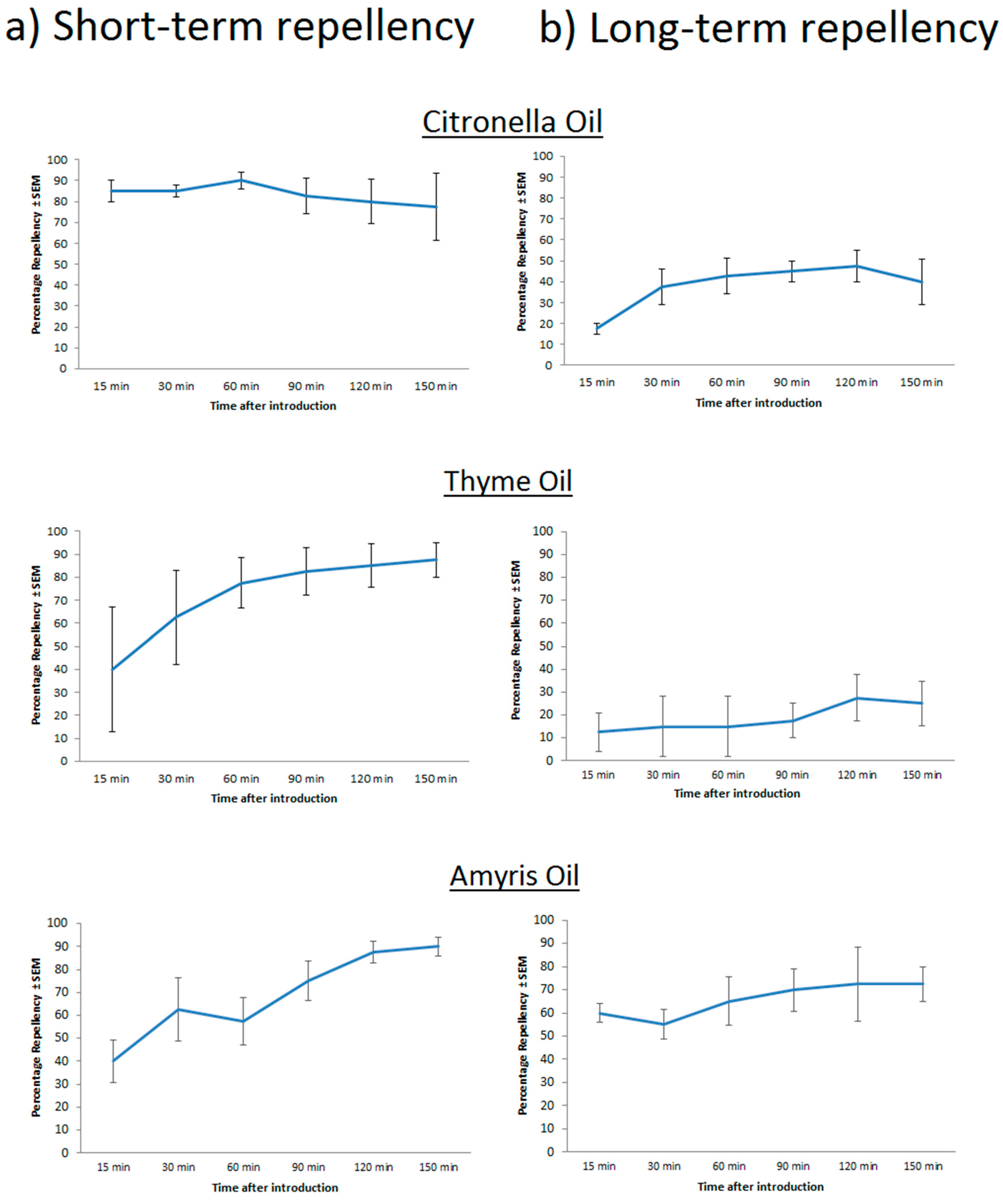 The relative spatial repellency of various plant essential oils at points immediately after treating a surface and after a five hour waiting period. Adult mosquitoes are placed in a closed 2-ft × 90-mm diameter cylinder, with one side containing a filter paper treated with the plant essential oil of interest. Relative mosquito abundance on both sides is quantified throughout the experimental interval to calculate percentage repellency. (a) Corresponds to the repellency caused by the plant essential oils if mosquitoes are immediately exposed to the filter paper after treatment and (b) corresponds to the repellency caused by various plant essential oils if mosquitoes are exposed to the treated filter paper after it is allowed to dry for 5 h. Oils that are predominantly composed of monoterpenoids (citronella and thyme oil) cause rapid, high levels of repellency in the short-term assay, with relatively lower values of repellency in the long-term assay. Oils that are composed primarily of repellent sesquiterpenoids cause lower immediate repellency, but maintain a higher level of repellency in the long-term assay (amyris oil).