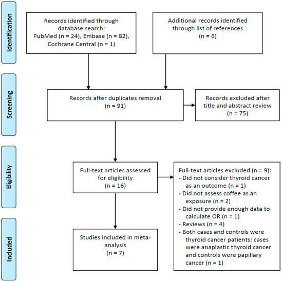A total of 107 articles published before 24 June 2016 were identified from PubMed, Embase, and Cochrane Central. Six additional articles were retrieved from the reference lists of the identified publications. From these 113 articles, 22 duplicates were removed. The titles and abstracts of the remaining 91 articles were reviewed for relevance. After screening, 16 articles were selected and assessed for eligibility. From these 16 articles, nine were excluded due to the following reasons: one study did not consider thyroid cancer as an outcome, two studies did not assess coffee as an exposure, one study did not provide calculable information for the OR, four studies were review articles, and one case-control study involved thyroid cancer patients for both the case group (anaplastic thyroid cancer) and the control group (papillary cancer). Therefore, seven articles were included in the meta-analysis [18,19,20,21,22,23,24] (Figure 1).