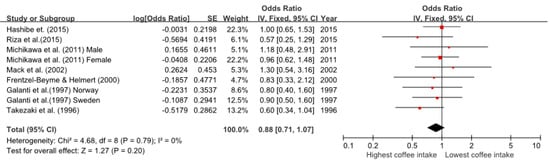 An overall summary OR and its 95% CI for highest coffee consumption compared with lowest (i.e., occasional or no) consumption was estimated based on the individual estimates from each study and compared across studies using a forest plot. Each study estimate was given a weight based on the inverse of the variance of the effect estimate. A fixed effect model was used to summarize the study-specific estimates. However, a random effects model was used if there was heterogeneity among study results, which was considered as an I2 statistic above 50%. In addition, several subgroup analyses were performed to assess the robustness of the summary estimates. The subgroups were analyzed by study design, geographic location, source of controls, and adjusted variables. Publication bias was not assessed as there were inadequate numbers of included studies to properly assess a funnel plot. Statistical analyses were performed using Reviewer Manager version 5.3 (The Nordic Cochrane Center, Copenhagen, Denmark). Statistical significance was defined as a p-value < 0.05.