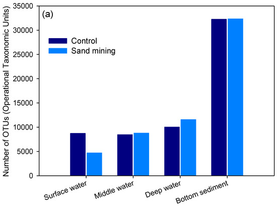 The bacterial taxonomic diversity as estimated by the number of OTUs is far greater in the sediment community than in the seawater community, regardless of the sampling period and location (Figure 3). A previous study on the composition of microbial assemblages in the Changjiang estuary and coastal regions of the East China Sea found that bacterial diversity in the sediment samples was much greater than that in the seawater samples and also Proteobacteria (72.9%) was the most dominant phylum in the sediment [37]. Moreover, sediment from the Antarctic continental shelf consisted of Proteobacteria as the most predominant bacterial lineage comprising >50% of the microbial biomass analyzed [41]. Similarly, our results also indicate that Proteobacteria is the most abundant phylum and comprises approximately 50% of the sediment bacterial assemblages in both the sand mining and control sites. However, this trend was not observed in deep-sea offshore oceans; taxonomic richness was found to be generally highest in the surface seawater and lowest in the seafloor sediment for deep-sea environments [38].