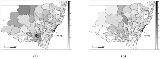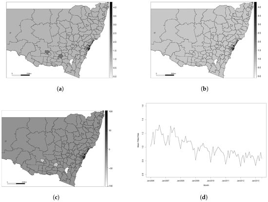 21] extended this approach to outline two possible approaches for constructing spatio-temporal mixtures. The first approach identifies a separate mixture model at each time period, thus meaning that at each time point there may be a different set of Poisson distributions from which the mixture is drawn. The second approach fits a single mixture model such that the same set of Poisson distributions exists across all time points, though areas can move between these mixture components at different time points. The latter method is preferred because the mixture components remain the same at all time points and thus different time points are directly comparable. This approach has benefits in terms of identifying possible clusters in the disease risk pattern, but has been designed for applications with a small number of time points, and may become computationally complex for data with a larger temporal scale.