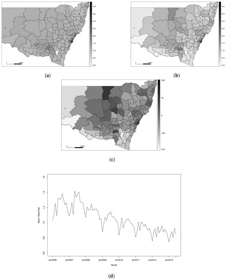 δ has a specification that combines a spatial CAR model and a random walk in time. These approaches are thus able to account for spatial and temporal trends as well as potential area-specific differences in trends, but, over longer time periods, the random walk may not capture the complexity of the temporal trends.