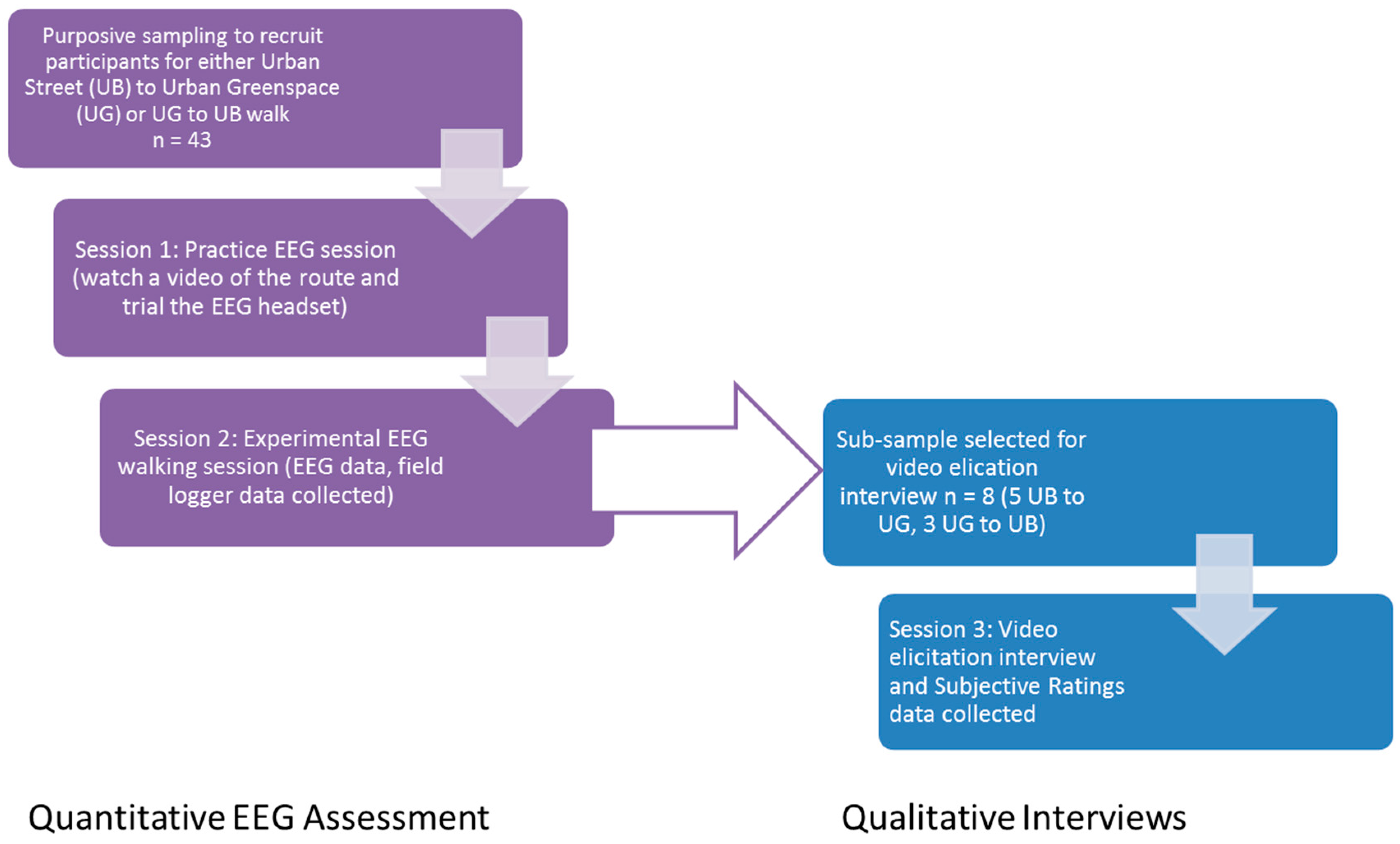 Purposive sampling was used to recruit 43 participants aged 65 years and over to walk a continuous route that was comprised of an area of green space and a busy urban street in Edinburgh, UK, while wearing an Emotiv EPOC + EEG headset. A week later, interviews were completed with eight participants, which was 19% of the sample (n = 8, mean age = 75.75 years, standard deviation = 6.76, range = 67–86 years). These eight participants made up the study population that is discussed in this paper. Due to participant fatigue and time constraints only a small sample of participants could take part in a follow up interview. Initially 10 participants were recruited, but two people subsequently declined to be interviewed due to time constraints. A total of three men and five women took part in the interviews. Figure 1 presents a flow chart of participant recruitment, sample size and the sessions they were involved in.