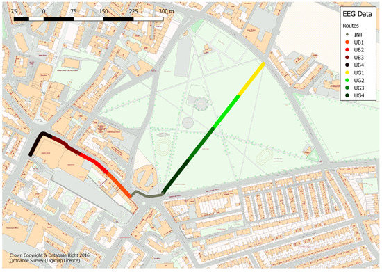 Participants walked along one of two routes, as indicated in Figure 2, taking in two urban environments; urban green (Figure 3a) and built urban busy (Figure 3b). Participants were required to walk either from the urban busy into the urban green space or vice versa, with the design being counterbalanced to understand if there are any neural or subjective responses that are typical of a given environment irrespective of what order they are presented in. Figure 2 also indicates an interchange area (in grey) between the green and urban busy space, which was removed from the analysis to ensure responses referred to just urban green or urban busy conditions. The green space section is a public park, which is a largely flat expanse of grass bordered by mature trees and covering 19 ha. The park also encompasses a central path 0.3 miles long, which is lined with trees. The urban busy section is around 0.2 miles long, with quite narrow street paving and bordered by relatively high buildings (mostly 5 storey apartment buildings) and shops, including a large supermarket. Between 2005 and 2014, there were 22 road accidents on this stretch of road [33]. Of the pedestrian casualties that have occurred, eight involved pedestrians, all of whom were below 65 years old. Table 2 provides a typology of the different environments.