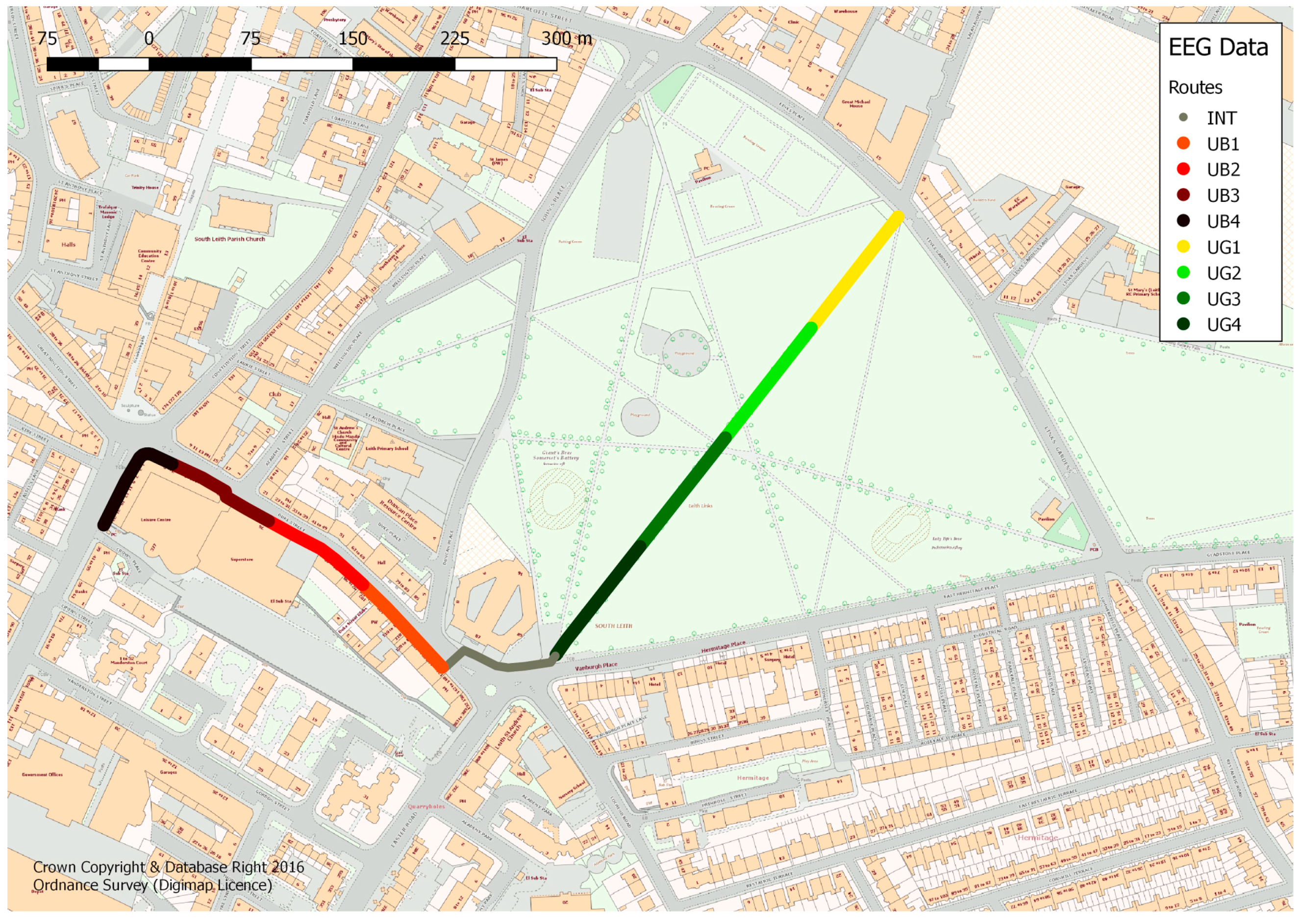 This study was conducted between May and September 2015 (excluding August 2015 when the Edinburgh Festival takes place). Participants took part in three sessions over the study period, as outlined in Figure 1. The first two sessions (a practice session and an experimental session, roughly a week apart) involved wearing the EEG headset and a data acquisition computer in a backpack and were carried out over two separate mornings (between 9:30 am and 12 pm) to ensure that participants did not suffer from time of day effects [29,30]. While we could not control the weather conditions, we ensured that participants only went out on dry days free from high winds or rain (but conditions could be cloudy, as long as they were dry). The practice session, undertaken after screening, served as an opportunity to demonstrate the EEG headset and familiarise participants with the route they would take (both described below) during the experimental session. This was achieved by showing participants a video of their given route lasting roughly 15 min.