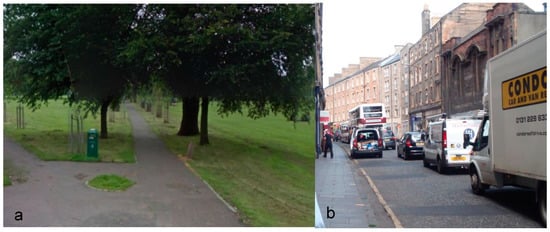 Street views of the two walking environments; (a) urban green and (b) urban busy (photo credit: OPENspace Research Centre).