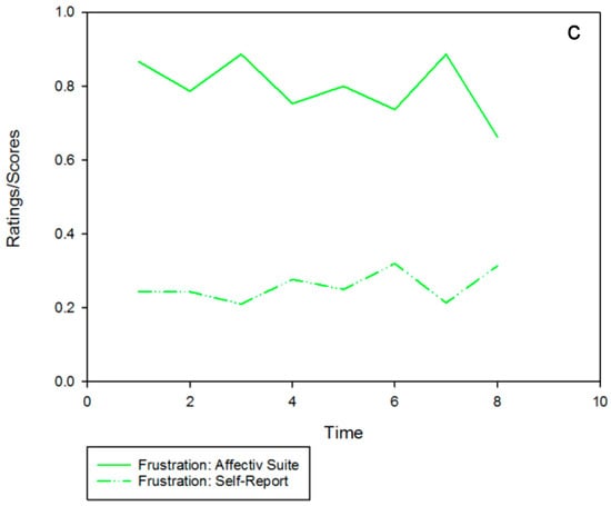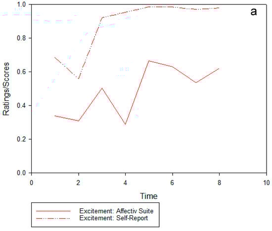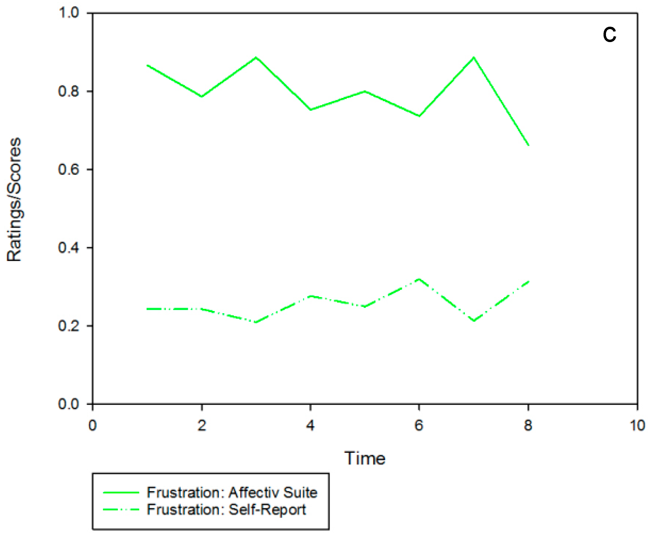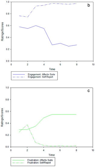 Figure 4a–c shows the three Affectiv Suite channels, “excitement” (Figure 4a), “engagement” (Figure 4b), and “frustration” (Figure 4c), with corresponding self-report ratings of the same terms.