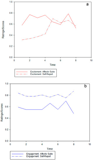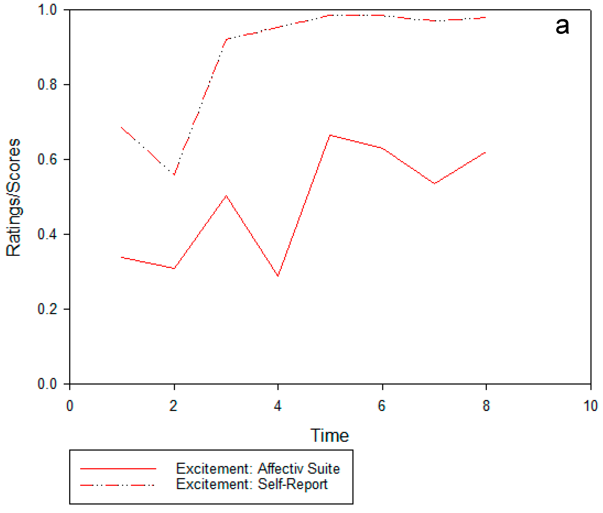 Figure 5a–c shows the three Affectiv channels, “excitement” (Figure 5a), “engagement”, (Figure 5b) and “frustration” (Figure 5c), with corresponding self-report ratings of the same terms.