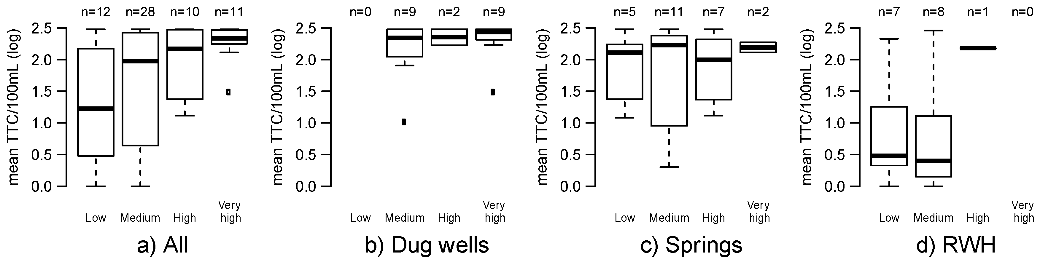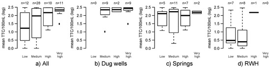 Boxplots of the thermotolerant coliform (TTC) concentrations for each RS category by: (a) All water sources; (b) Dug wells; (c) Springs; (d) Rainwater harvesting (RWH) systems.