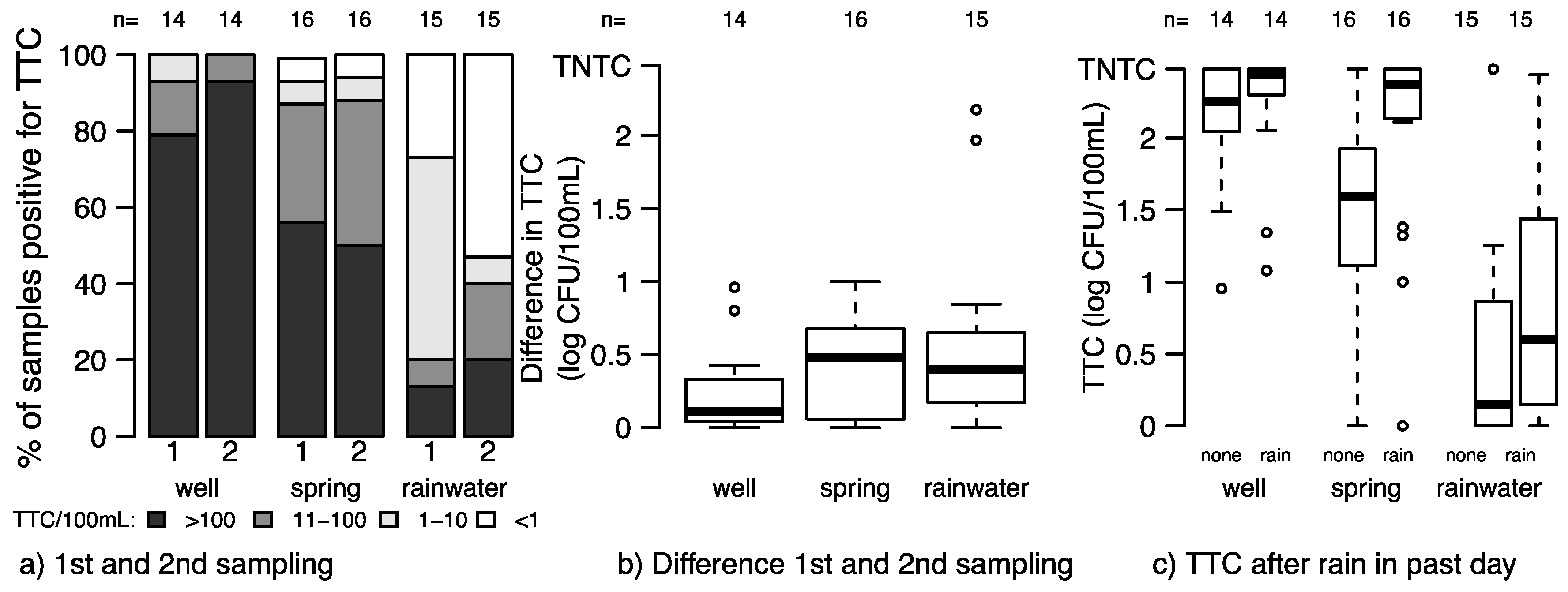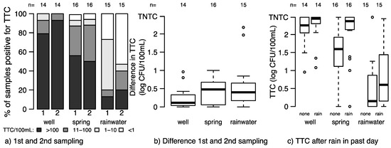 Variability between results from two samples collected from the same water source. (a) Percent of samples positive for TTC during the first and second samplings among sources tested twice; (b) Boxplot of the difference in TTC between the first and second sampling in each source type among the sources tested twice; (c) Boxplot of the TTC concentrations in samples collected when no prior rain (none) or rain in the last day (rain) in all tested source types. TNTC: too numerous to count.