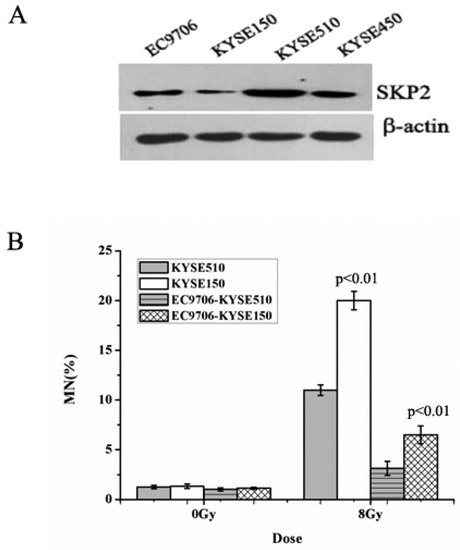 Effects of endogenous SKP2 expression on the RIBE of esophageal carcinoma (EC) cells. (A) SKP2 expression in four EC cells. The sequence of SKP2 levels was KYSE510 > KYSE450 > EC9706 > KYSE150. β-actin was used as an internal control; (B) MN formation in γ-ray irradiated EC cells (KYSE510, KYSE150) and bystander EC cells (EC9706). MN yields of 8-Gy-irradiated KYSE150 were significantly higher than those of irradiated KYSE510 (p < 0.01). As the bystander cell, EC9706 co-cultured with irradiated KYSE150 had higher MN yields than EC9706 co-cultured with irradiated KYSE510 (p < 0.01). Results correspond to the mean ± SD of experiments, performed in triplicate, in each case.