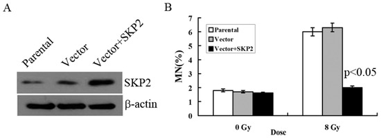 We constructed the overexpression vector of SKP2 and positively transfected it to EC9706 cells in order to detect the effects of SKP2 overexpression on RIBE. The parental cell line and empty vector were used as control. Compared with the control groups, Western blot results showed that the expression level of SKP2 increased after positive transfection, showing that the overexpression vector of SKP2 was function (Figure 2A). Then, MN assay results showed that the MN frequency in bystander EC9706 cells, co-cultured with transfected KYSE150 cells (with increased SKP2 expression), was lower than that of the control groups (p < 0.05) (Figure 2B).