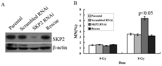 To verify the effects of SKP2 on RIBE, we constructed the RNAi and rescue vector of SKP2 in order to examine the effects of SKP2 expression on the MN assay. The parental and scrambled RNAi were used as control. Compared with the control groups, Western blot results showed that the expression level of SKP2 decreased after knockdown, but the SKP2 level was rescued after transfection rescue vector, showing that these two vectors (RNAi and rescue) were all functional (Figure 3A). MN assay results showed that the MN frequency in bystander EC9706 cells co-cultured with SKP2 knockdown KYSE510 cells was higher than those of the control groups (p < 0.05). However, in the rescue group cells, the MN frequency was also significantly lower than that of RNAi cells (p < 0.05) (Figure 3B). Thus, the results proved that changes of SKP2 level have effects on the results of RIBE.