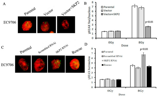 Effects of SKP2 expression on the repair of DSBs induced by RIBE. (A) γ-H2AX foci in nucleus of EC9706 cells co-cultured with parental, vector, and vector + SKP2 irradiated KYSE150 cells; (B) The number of γ-H2AX foci per nucleus in EC9706 co-cultured with induced SKP2 cells was significantly lower than that in EC9706 co-cultured with control cells (p < 0.01); (C) γ-H2AX foci in nucleus of EC9706 cells co-cultured with parental, scrambled RNAi, SKP2 RNAi, and SKP2 rescue irradiated KYSE510 cells; (D) The number of γ-H2AX foci per nucleus in EC9706 co-cultured with SKP2 knockdown cells was significantly higher than that in EC9706 co-cultured with control cells (p < 0.01). Conversely, the number of γ-H2AX foci per nucleus in EC9706 co-cultured with SKP2 rescued cells was decreased when compared with the SKP2 RNAi group. In the γ-H2AX focus formation assay, two hundred nuclei were analyzed per experiment. The γ-H2AX focus and nucleus was stained with Cy3 and DAPI, respectively. Results correspond to the mean ± SD of experiments, performed in triplicate, in each case.