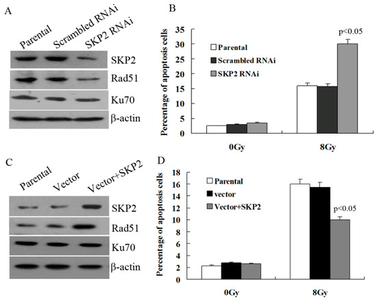Effects of SKP2 on Rad51, Ku70 expression, and apoptosis of RIBE cells. (A) Down-regulation of SKP2 in irradiated KYSE510 cells led to a decreased expression of Rad51 in bystander EC9706 cells. No changes in Ku70 expression were observed; (B) The percentage of apoptosis EC9706 cells co-cultured with KYSE510 cells with a low SKP2 level was significantly higher than those of the control cells (p < 0.05); (C) Up-regulation of SKP2 in irradiated KYSE150 cells led to increased expression of Rad51 in bystander EC9706 cells. No changes in Ku70 expression were observed; (D) The percentage of apoptosis EC9706 cells co-cultured with KYSE150 cells with a high SKP2 level was significantly lower than those of the control cells (p < 0.05). Results correspond to the mean ± SD of experiments, performed in triplicate, in each case.