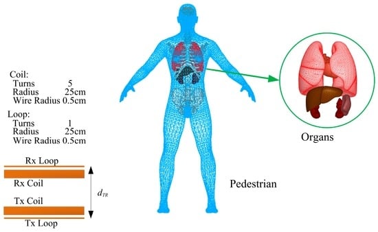 - Ding, P.P.; Bernard, L.; Pichon, L.; Razek, A. Evaluation of electromagnetic fields in human body exposed to wireless inductive charging system. IEEE Trans. Magn. 2014, 50. [Google Scholar] [CrossRef]