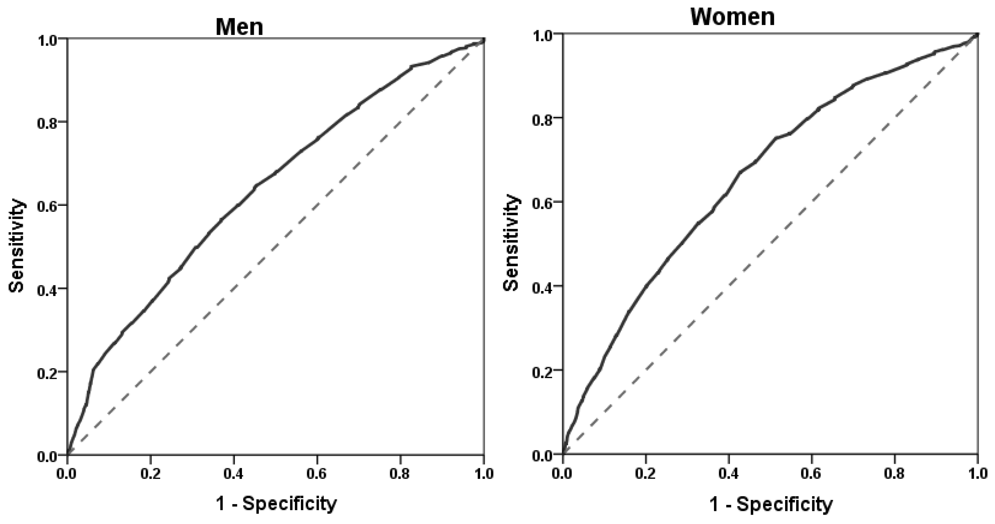 According to the IDF criteria, ROC curve analysis was used to determine the optimal ethnic-specific cut-off points of WC for predicting at least two components of metabolic syndrome (Table 3, Figure 1). Among men, WC at a cut-off value of 85 cm resulted in the highest Youden index (0.193) with a corresponding sensitivity of 60.0% and specificity of 59.3% (Area under the ROC curve: 0.636, standard error: 0.014, p < 0.001, 95% confidence intervals: 0.608–0.664). At the traditional cut-off value of 90 cm of WC for men, the sensitivity dropped to 41.5%, and specificity increased slightly to 75.8%. Similarly, among women, WC at a cut-off point of 82 cm resulted in the highest Youden index (0.243) with the corresponding sensitivity and specificity of 67.0% and 57.3%, respectively (Area under the ROC curve: 0.658, standard error: 0.013, p < 0.001, 95% confidence intervals: 0.631–0.684). At the traditional cut-off point of 80 cm WC among women, the sensitivity sharply increased to 75.2%, but this occurred at the cost of a significant drop in the specificity from 57.3% to 48.7% (Table 3).