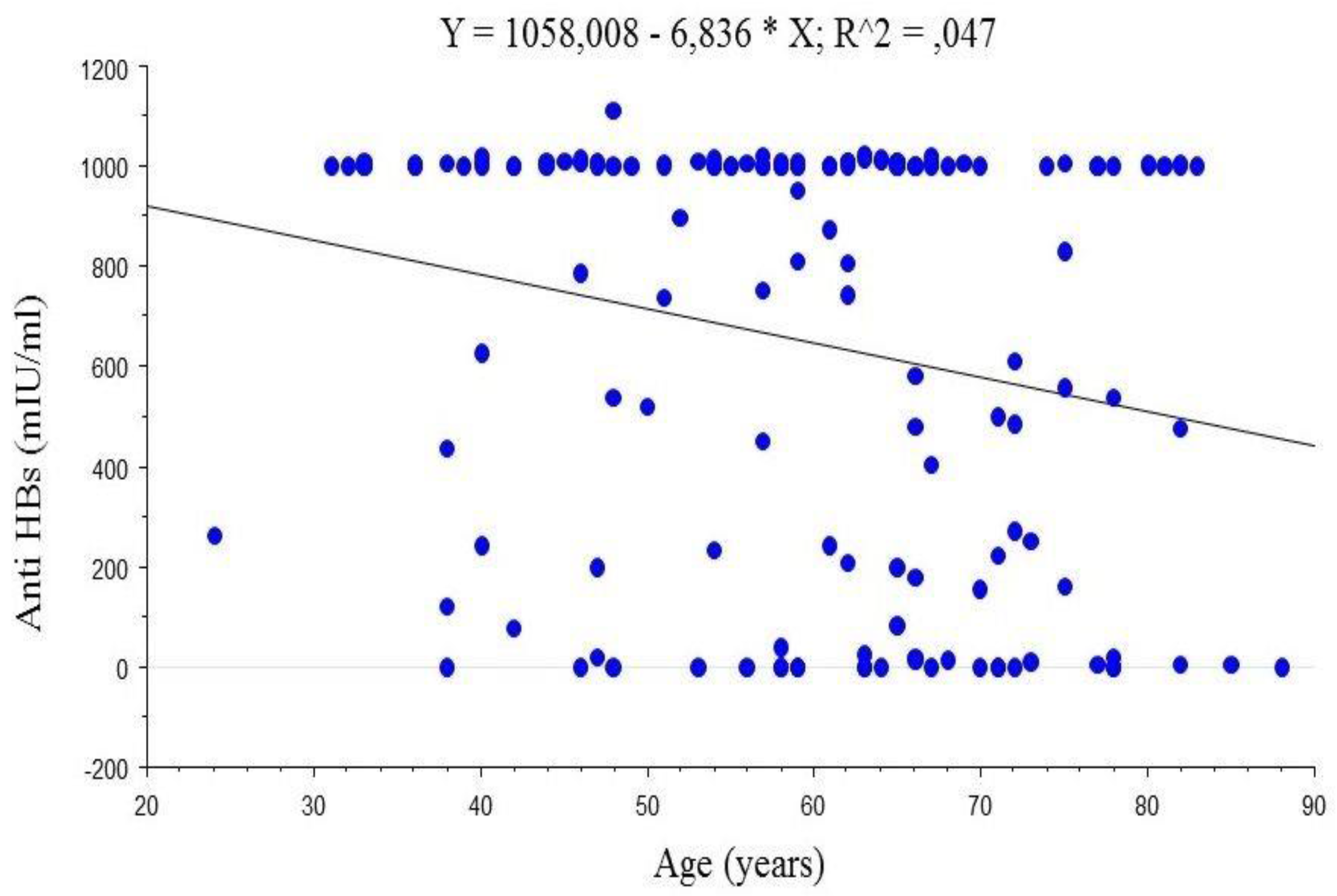 Correlation of anti-HBs titres after receiving the third dose of hepatitis B virus (HBV) vaccine with patient age (n = 149).