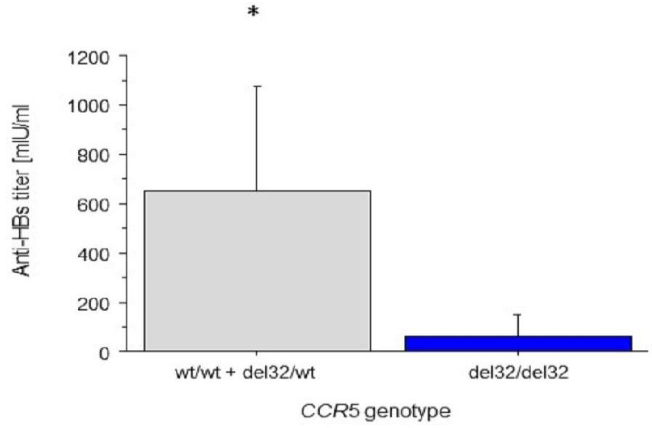 A one-way ANOVA revealed a statistically significant association between CCR5 genotype in a co-dominant model of inheritance and anti-HBs titres (p = 0.04). Therefore, we adapted a recessive model of inheritance for a Δ32 CCR5 polymorphism. The median anti-HBs titre in Δ32/Δ32 homozygotes was 61 mIU/mL and in other genotypes: 660.2 mIU/mL (p = 0.0478).
