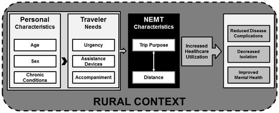 Relationship between personal characteristics, traveler needs, non-emergency medical transportation, and theorized health outcomes in a rural context. NEMT: non-emergency medical transportation.