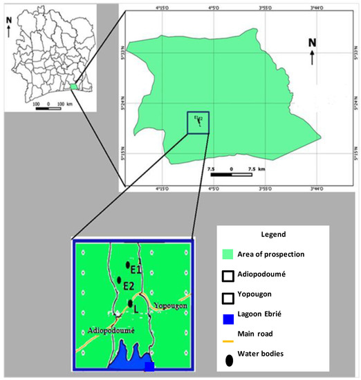 Study sampling site. Three water bodies were selected based on populations’ use and associated socio-cultural activities. L: Ebrié lagoon; E1: pond 1; E2: pond 2.