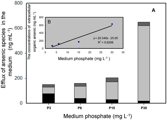 Efflux of As speciation in the medium after cultures were grown for 20 h by T. pyriformis. (A) Concentrations of As species. Black: As(III); gray: DMAs(V); dark gray: MMAs(V); (B) The relationship between extracellular organic As concentrations and the initial P levels. All data are the means ± SE (n = 4).