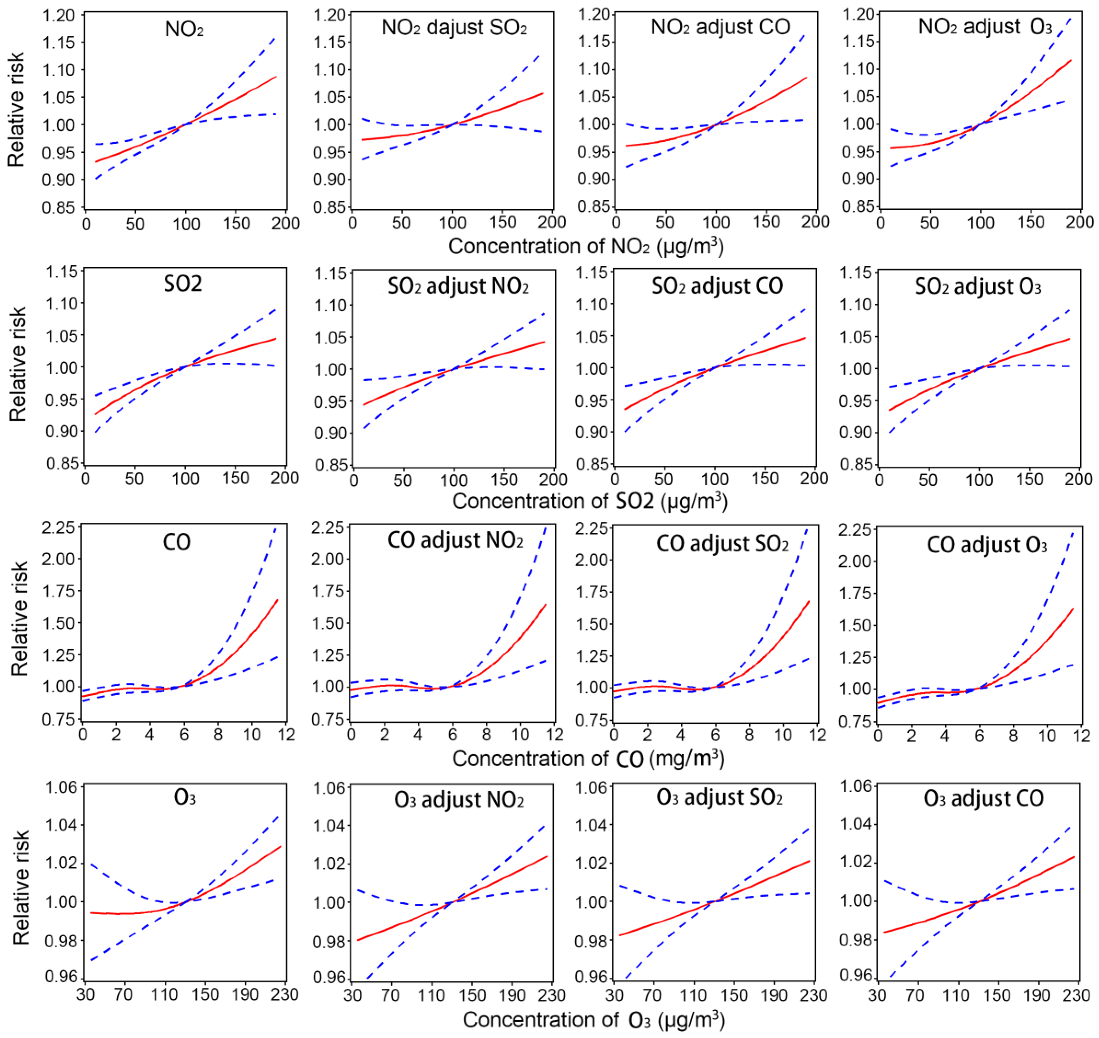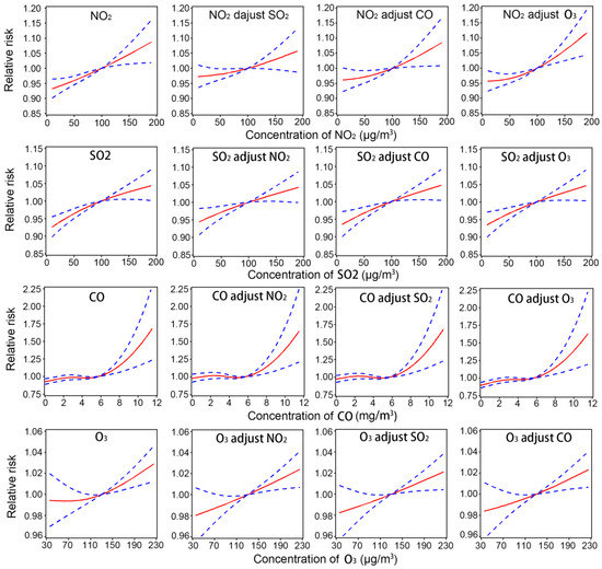 We graphically examined the exposure-response relationship of air pollutants with stroke admissions. We applied natural cubic splines with 3 df for NO2, SO2 and ozone, and 4 df for CO to model the relationship. Two-pollutant models adjusting the other gaseous air pollutants were fitted to check the robustness of our results.