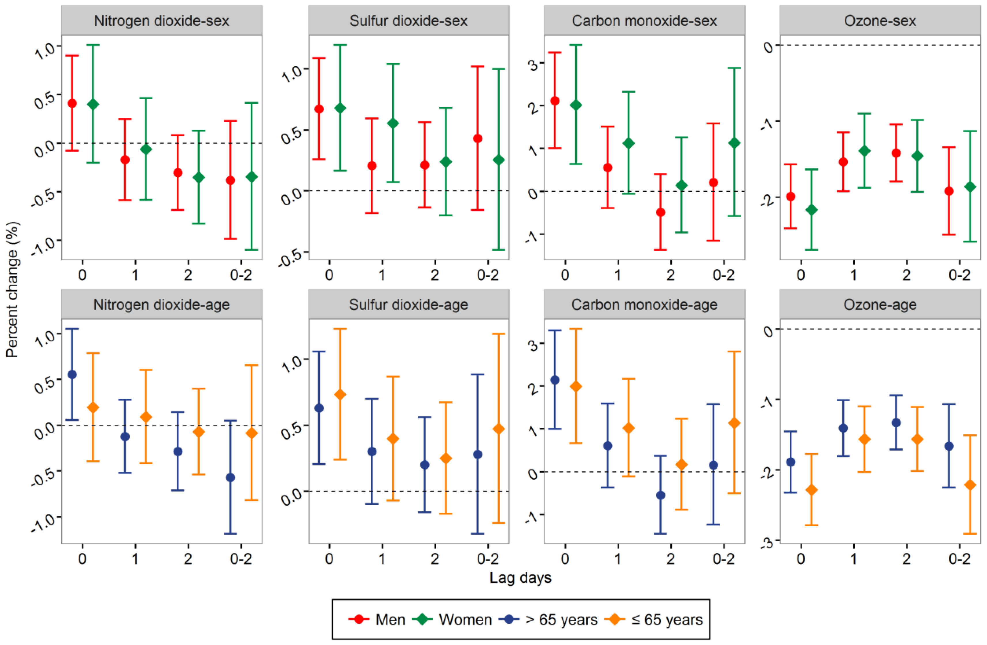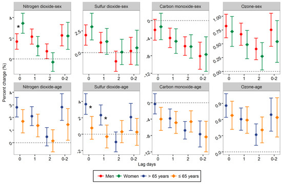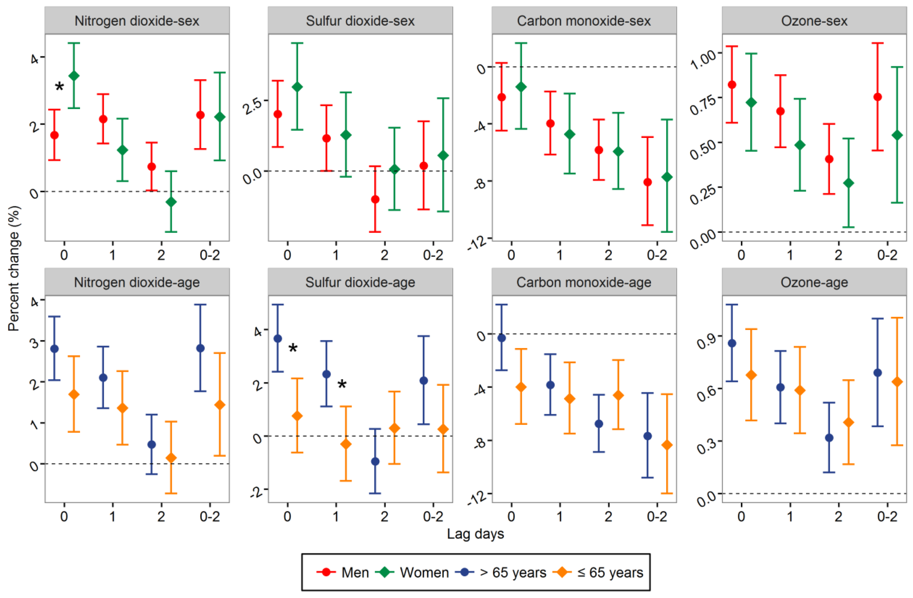 Percent change (95% CI) in hospital admissions for stroke associated with a 10.0 μg/m3 increase in NO2, SO2, and ozone, and 1.0 mg/m3 increase in CO stratified by sex and age in warm seasons. * The difference between two subgroups was statistically significant (p < 0.05).
