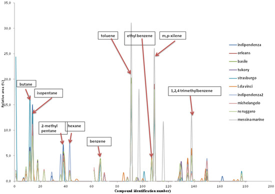 In addition to the quantitative analyzes performed in stations 1–10, profiles of the volatile substances present in the neighborhood of specific activities were recorded. In these cases, a total of 181 volatile compounds were monitored. The identification of analytes in the unknown samples was carried out on the basis of 80% similarity of their mass spectra compared with those of the instrument library.