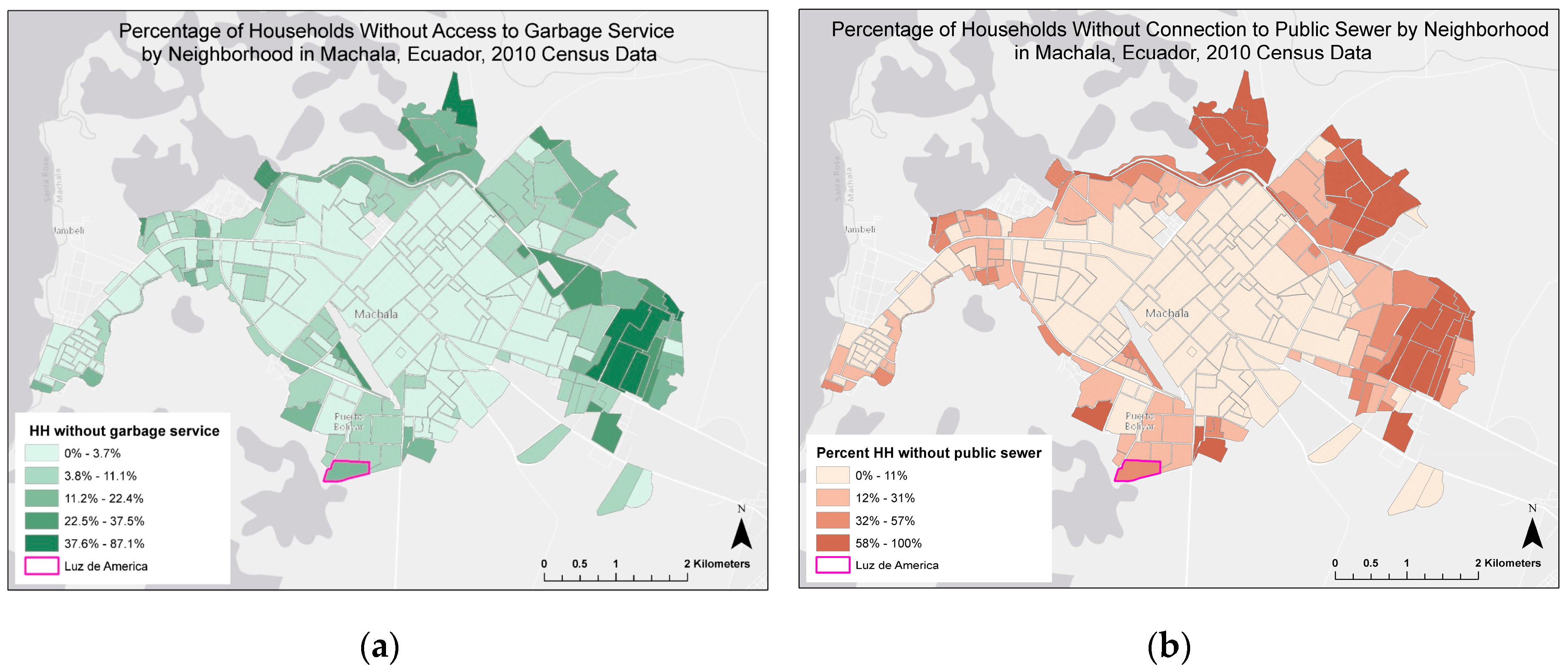 Location of study site in Machala, Ecuador. Luz de America indicated with neighborhood level census information from 2010 data: (a) Percentage of households without access to garbage service (21.2% for Luz de America) and (b) without connection to public sewerage system (37.7% for Luz de America). Data source: Instituto nacional de estadistica y censos (INEC). Neighborhood map source: National Institute of Meteorology and Hydrology of Ecuador (INAMHI).