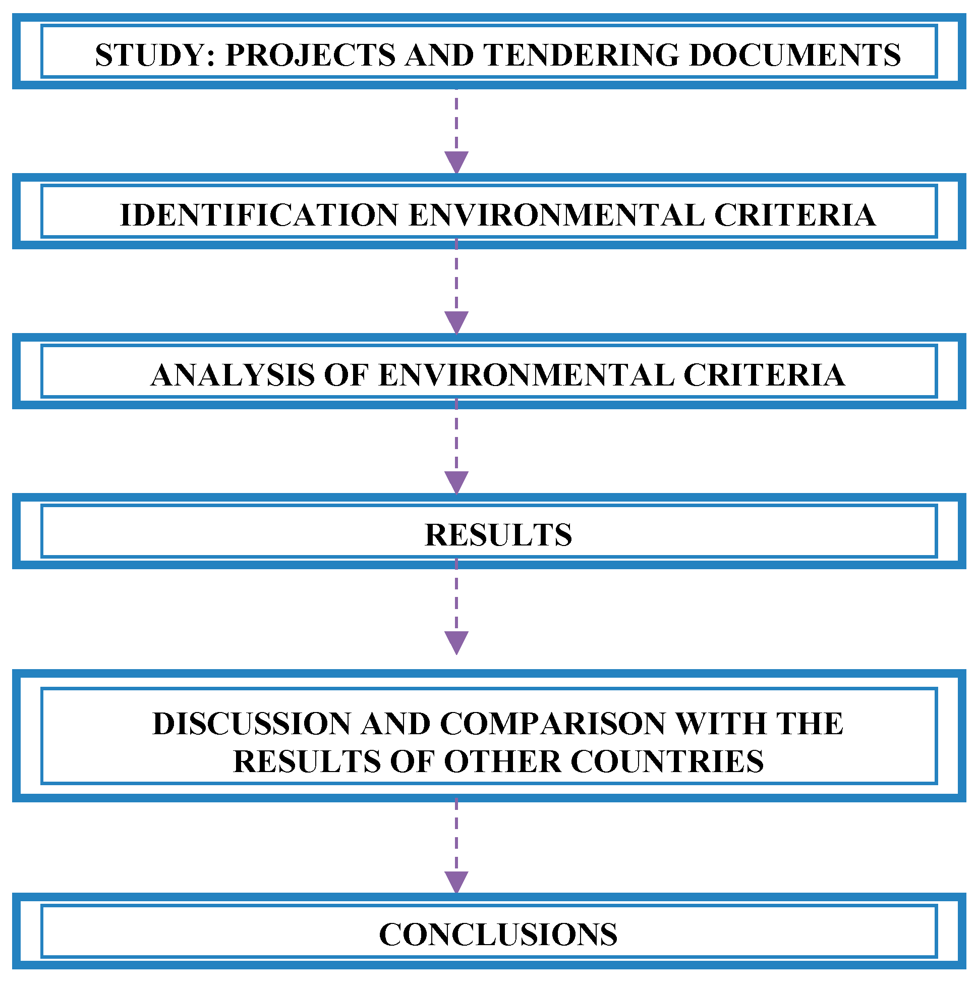 The method is divided into six steps (Figure 1). The first step is to study the project and the tendering documents. In the step two, each case of the sample was analysed to locate any environmental criteria involved in the tenders. These environmental criteria are analysed and classified by subsector (civil engineering or building), geographical scope and project budget. Thereafter, the weight of the environmental criteria is analysed and classified by subsector, geographical scope, and contract execution budget. Finally, the environmental criteria identified are related with other criteria used in the tendering process. In the next step, a discussion and comparison with the results from other countries is included and some measures are proposed to improve the use of environmental criteria in Spanish tendering processes. Lastly, the conclusions are presented.