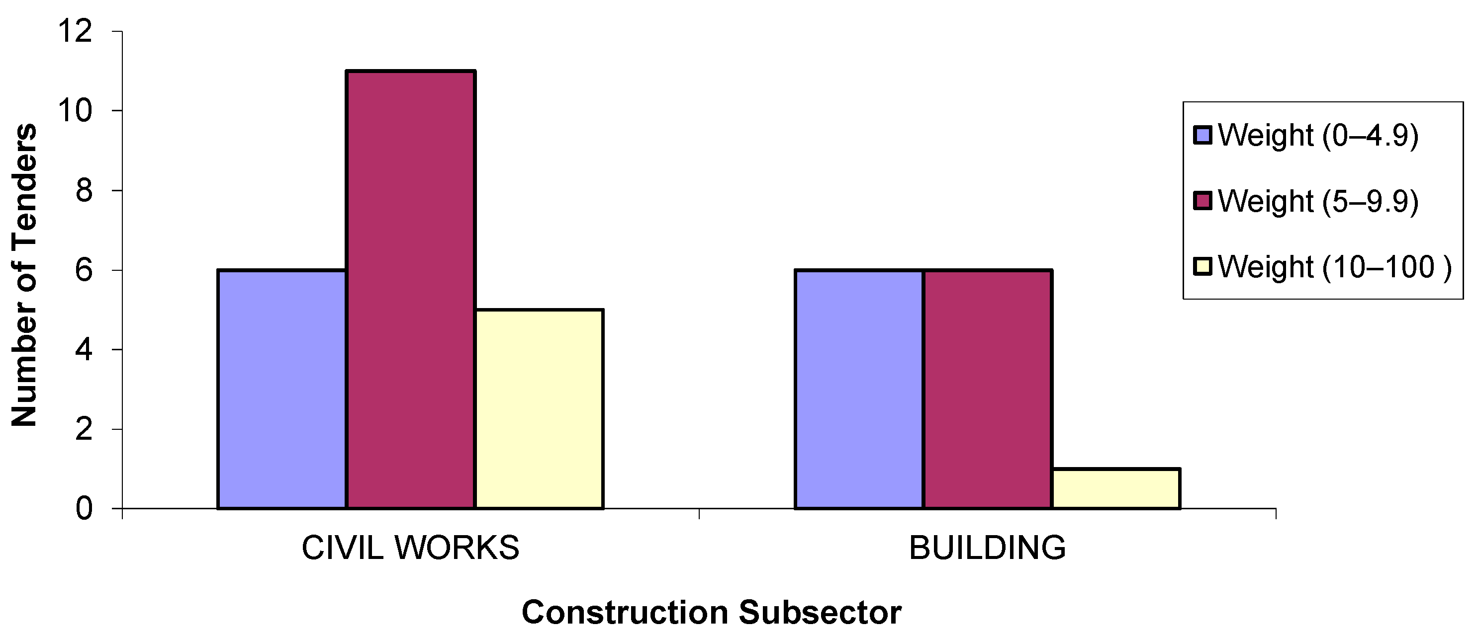 In Figure 2, the weighting of the environmental criteria is related to the subsector. The environmental criterion has more weight in civil engineering projects than in building projects, in which the weighting was above 10 points in only one of 13 cases.