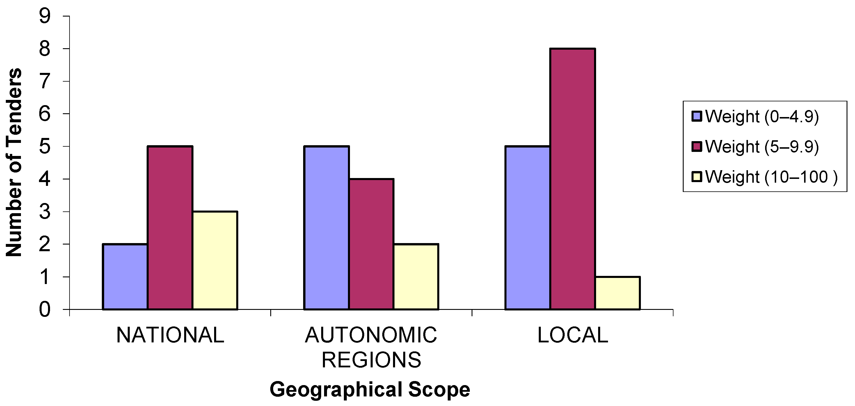 In Figure 3, the distribution of the weighting of the environmental criteria is related to the geographical scope of the administration. In 57.1% of the tenders of local administrations, the weighting of the environmental criteria ranged between 5 and 9.9 points out of 100. In the autonomous regions, five projects were between 0 and 4.9 points out of 100, and four projects were between 5 and 9.9 points out of 100. At a national level, 50% of the tenders were weighted between 5 and 9.9 points.