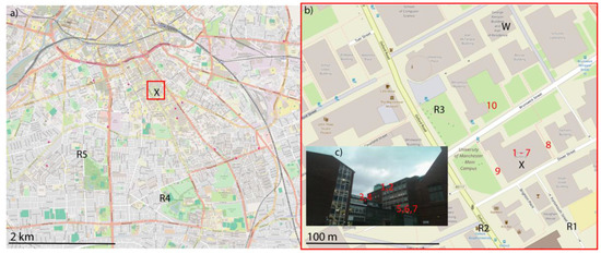 Manchester is one of the largest conurbations in the UK; the experimental site is located to the southeast of the city centre in the area inhabited by the University of Manchester. Figure 1a shows the study area (red box) in relation to the city of Manchester, Figure 1b shows a detail of the squared areas in Figure 1a indicating the street layout around the test building; a view from the south side of the test building is shown in Figure 1c. The release points are indicated by R1 to R5, and sampling points by numbers 1–10; 1–7 are within the test building.