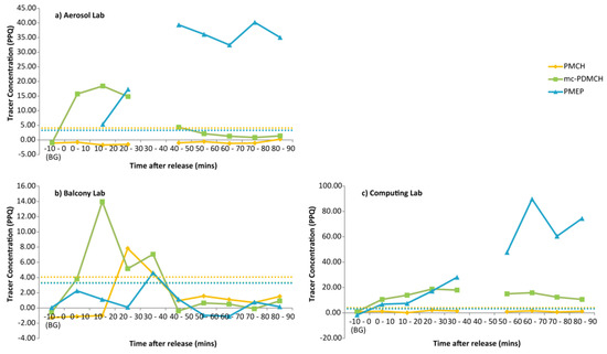 Time series of tracer decay over 90 min for three rooms in the test building; (a) the aerosol lab was a small lab with closed windows; (b) the balcony lab was a small well-ventilated lab with an open door and (c) the computing lab was a larger room used by students. Solid lines indicate the measured PFC concentrations; dashed lines represent the line of significance (2 × standard deviation of all background measurements).