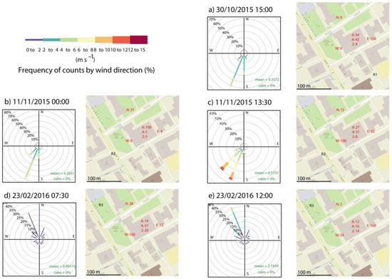 Wind roses and maps showing position of release (R) and outdoor samples for five tracer experiments released in Manchester with wind speeds measured at 1 Hz. Concentrations are shown as percentages of maximum concentration measured on that day. Sample positions are at ground level, apart from the three positions measured outside rooms in the test building on the second, fourth and sixth floors, which are indicated by numbers. X indicates that a sample was not collected on that day. Map images © OpenStreetMap contributors [27].
