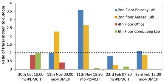 The time of day in which the experiments took place may have a strong influence on the amount of tracer that enters into a room. Tracer concentrations outside are affected by plume dynamics, which are themselves affected by meteorological conditions; low wind speeds cause tracer to be less homogenous [22], while the vertical spread of a plume at higher wind speeds is affected by the stability of the air [21]. The ventilation conditions in the room under question, and in adjoining rooms, may have temporal variability. While efforts were made to ensure the windows and doors of the study rooms remained unchanged, other doors and windows in other parts of the building may have been opened or closed throughout the day, and temperature profiles in the building could change, resulting in different ventilation characteristics. Measurements took place at different times of a working day, and overnight, so occupancy will be variable. For example, the measurements undertaken on 30 October 2015 were during a working day at term-time within a university, therefore there would be a considerable passage of people through the building when compared to the experiments undertaken at dawn or midnight. The lowest ratios of indoor/outdoor air within the computing room—the room most used by students—do occur out of normal working hours.