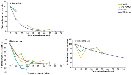 Decay curve of CO2 and PFC tracer from point of maximum concentration, displayed as a percentage of maximum concentration for (a) the aerosol lab; (b) the balcony lab and (c) the computing lab in the test building.
