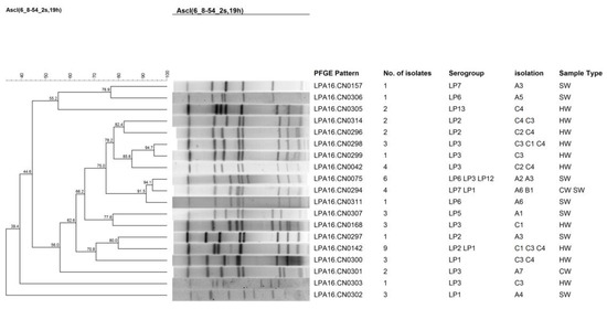 - Zhou, H.; Ren, H.; Zhu, B.; Kan, B.; Xu, J.; Shao, Z. Optimization of pulsed-field gel electrophoresis for L. pneumophila subtyping. Appl. Environ. Microbiol. 2010, 76, 1334–1340. [Google Scholar] [CrossRef] [PubMed]