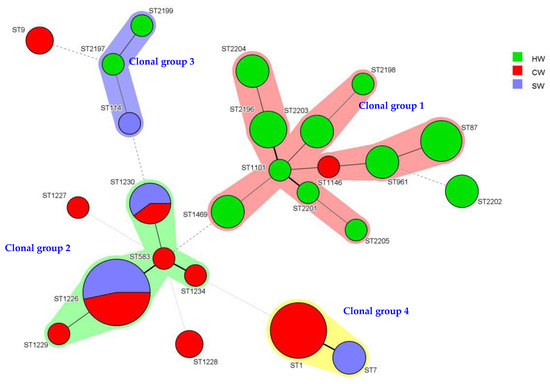 Minimum spanning tree analysis of 73 Legionella isolates from several water sources in Wenzhou, China. These strains were isolated from 2009 to 2016. In the minimum spanning tree, the sequence types (STs) are displayed as circles. The size of each circle indicates the number of isolates within this particular type with the STs are shown beside the circles. The colors of the halo surrounding the STs denote types that belong to the same clonal group. CW: cooling tower; HW: hot springs; SW: shower water.