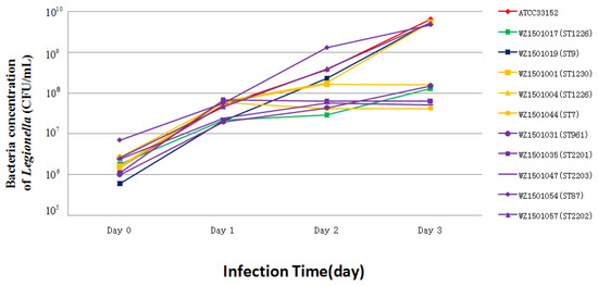Mouse BALB/c crophage cell line J774 was used for testing the intracellular growth ability of Legionella isolates as L. pneumophila serogroup 1 (ATCC33152 was used as a positive control) (Figure 4). Gimenez staining on day 2 of J774 cell infection allowed observation under a light microscope, which showed that all the ten isolates had intracellular growth ability in J774 cells. To further evaluate the ability of the strains, bacteria numbers were counted. Interestingly, six strains (group 1) exhibited continuous growth within 72 h under the standard assay’s condition and four strains (group 2) showed significant growth within 48 h after which they plateaued at 72 h (Figure 4). The group 1 strains consisted of 6 strains: ST1230, ST1226, ST9, ST961, ST87, and ST2202, which came from the cooling tower, showers, and hot springs. The strains of group 2: ST1226, ST2201, ST7 and ST2203 belonged to those from the showers and hot springs. Although the sources of the two groups overlap, the intracellular growth ability of the strains is shown to be significantly different (p < 0.05) (Figure 4). Strains from the same source may exhibit different intracellular growth abilities; the WZ1501001 (ST1230) strain showed a higher growth ability than WZ1501044 (ST7) although these two strains were isolated from the same source, i.e., hospital shower. On the other hand, strains of the same ST type may also show different intracellular growth abilities. The growth ability of WZ1501004 (ST1226) from group 1 was significantly higher than WZ1501017 (ST1226) from group 2. Taken together, the results show that intracellular growth abilities are not correlated with their sources or ST types.