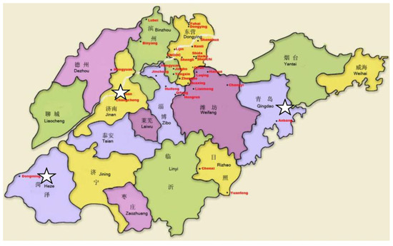 Location of the study population. Shandong Province, located in the east of China, has a population of 92.8 million people and a land area of 153,300 km2. We included 418 research participants from Qingdao, 345 from Jinan, and 539 from Heze. ☆: Sample collection areas.