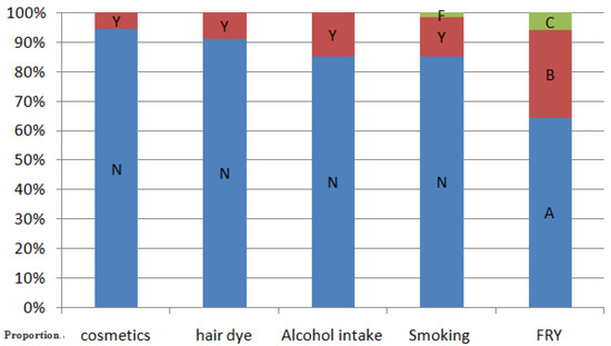 Characteristics of the study population. Univariate analyses of associations between cosmetics, alcohol intake and hair dye with serum concentrations of trace elements were performed using the Wilcoxon test; the Kruskal-Wallis test was used to assess associations between smoking, and consumption of fried foods with serum concentrations of trace elements. N: no; Y: yes; F: former smoker; A: 1–2 times per month; B: 1–2 times per week; C: Every day.