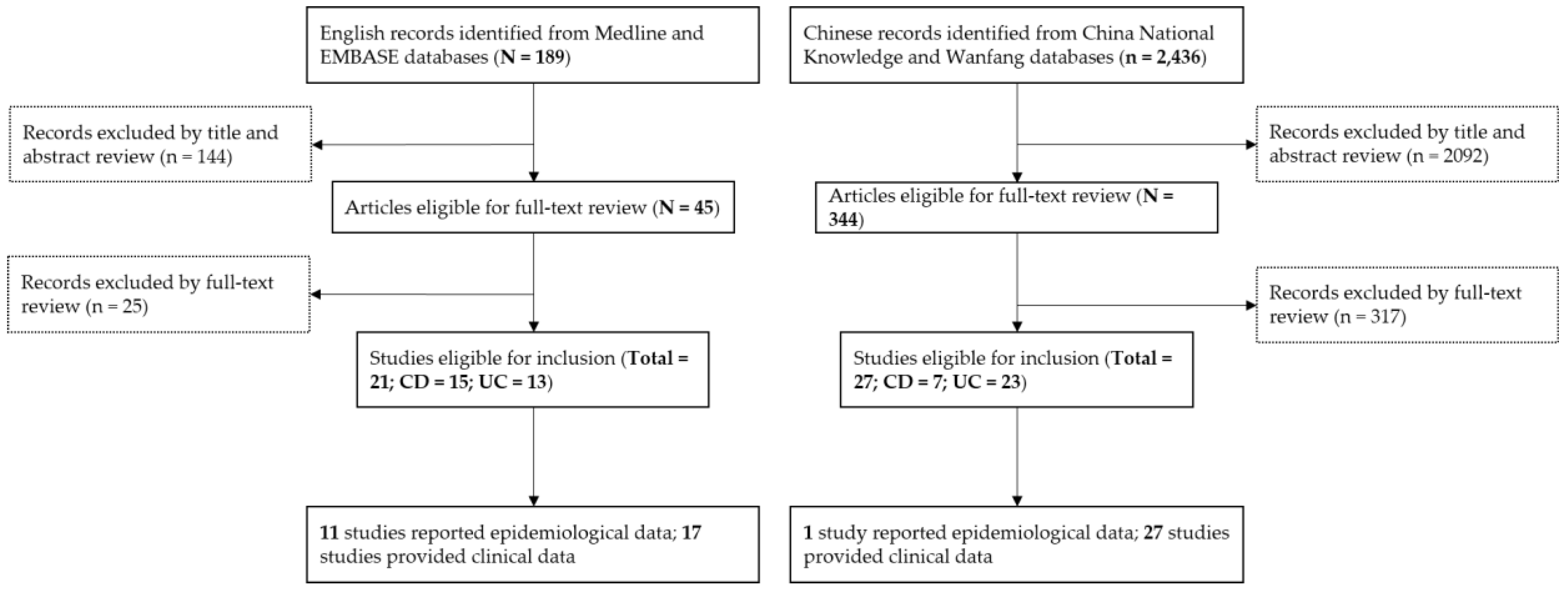The search strategy retrieved 2436 unique Chinese publications and 189 unique English publications. Of these, 2092 Chinese papers and 144 English papers were excluded using the title and abstract review, leaving 344 Chinese papers and 45 English papers for full text review. A total of 27 Chinese publications and 21 English publications were finally included in the study, after the full text review (Figure 1). Of these, seven studies reported the incidence rate of Crohn’s disease (CD) and three studies reported the prevalence rate of CD. For ulcerative colitis (UC), seven studies reported the incidence rate and three studies reported the prevalence rate. Four studies reported the prevalence rate of IBD with a combination of CD and UC. The clinical characteristics of CD were reported in 18 studies, with a median number of 69 CD cases (range: 15–515). The clinical characteristics of UC were reported in 35 studies, with a median number of 189 UC cases (range: 35–3922). The characteristics of the included studies can be seen in Supplementary Table S2.