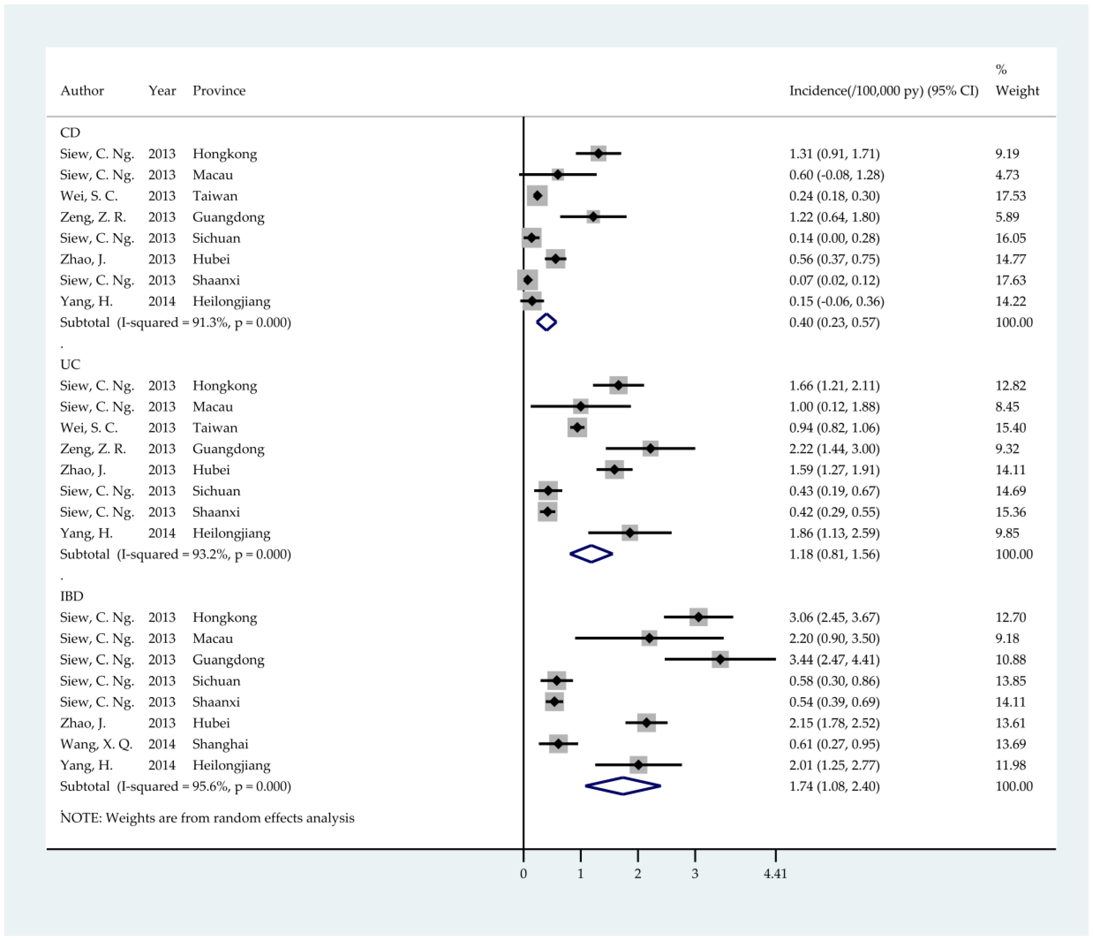 The rising occurrence of IBD cases and possible differences in the clinical characteristics among different races, indicate that the clinical experience in developed countries is unlikely to be applicable to China, which highlights the need to carry out further studies to investigate the epidemiological and clinical characteristics of Chinese patients. To provide the international research community with an overview of the disease burden and the key clinical features of IBD in China, we conducted this systematic review and meta-analysis to estimate the crude incidence and prevalence rate, and to summarize the clinical characteristics, by using the published data from both English and Chinese literature.
