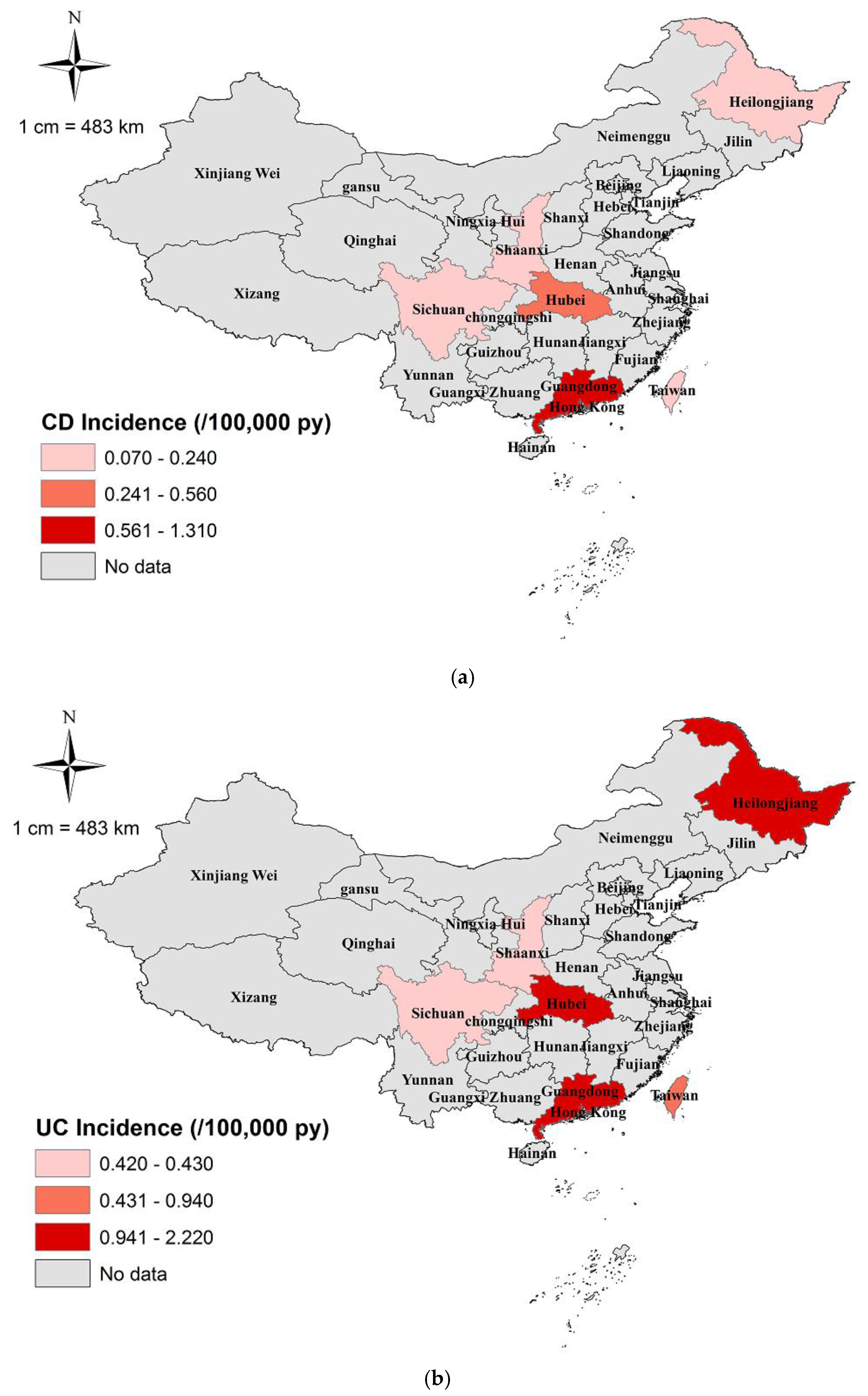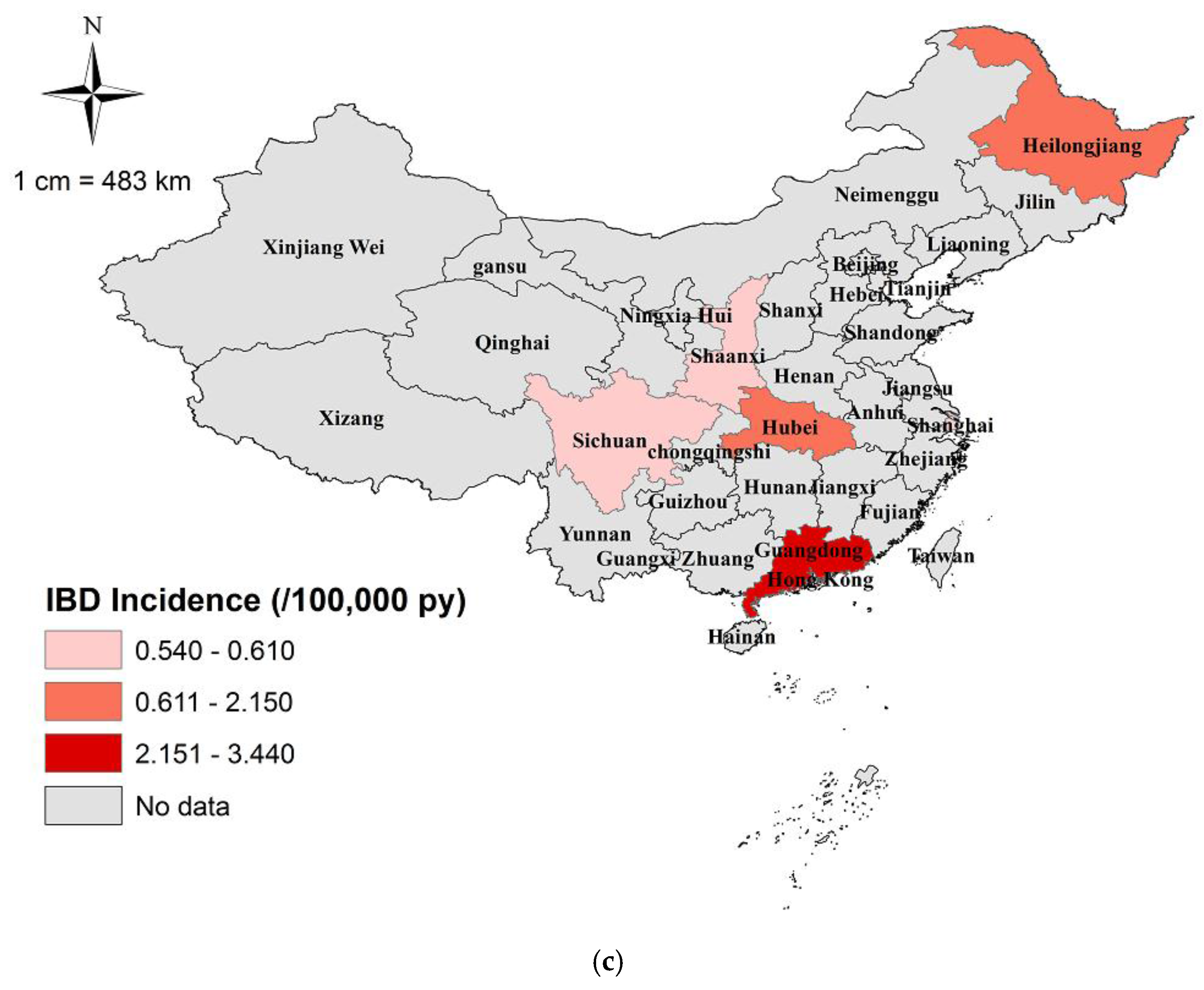 National map of the incidence rate of inflammatory bowel disease: (a) Crohn’s disease (CD); (b) ulcerative colitis (UC); (c) inflammatory bowel disease (CD and UC).