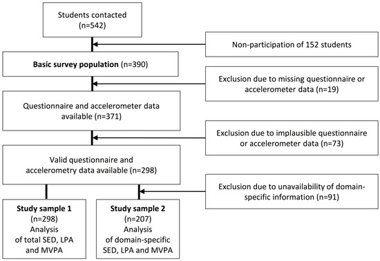 In this study, 542 children and adolescents were invited to participate. Informed consent was obtained from 390 (72%). Though written consent of the parents was obtained, 2 pupils denied to participate in the study. The study sample was divided into two groups because domain-specific information was not available for all children. Figure 1 shows the composition of the study sample and the exclusion criteria. Accelerometer and questionnaire data were provided by 371 participants.