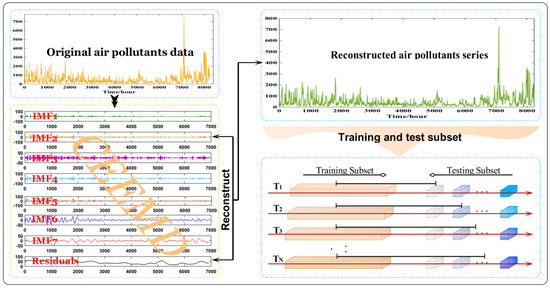 Artificial intelligence models that are exploited to forecast air pollutant concentration mainly include some artificial neural networks and intelligent optimization algorithms, which are very prevalent due to their high-performance learning capacity for nonlinear patterns like air pollution. Song et al. applied a cuckoo search optimization algorithm to optimize the parameters of Weibull, Rayleigh, Lognormal and Gamma distribution functions, which can be conducive to implement interval forecasting further. Besides, the paper applied an adaptive neuro-fuzzy model to perform deterministic forecasting of PM2.5 and PM10 from three cities in China [9]. Kanchan Prasad et al. developed an adaptive neuro-fuzzy inference system to comprehensively forecast daily air pollution concentrations of five air pollutants, namely SO2, NO2, CO, O3 and PM10. In order to reduce the computational cost, a forward selection method was exploited to choose optimal subsets of input dataset [10]. Hybrid artificial intelligence models are more effective and robust than single models. Qin et al. built a hybrid model combining ensemble empirical mode decomposition (EEMD), cuckoo search (CS) and a back-propagation artificial neural network to implement PM forecasting, and the simulation revealed that the hybrid outperformed the benchmark models mentioned in the paper [11]. Niu et al. proposed a novel hybrid decomposition-and-ensemble model based on complementary ensemble empirical mode decomposition (CEEMD), grey wolf optimizer and support vector regression (SVR) to perform PM2.5 forecasting, and the empirical study illustrated that the proposed hybrid forecasting model was significantly superior to the benchmark models used in the paper [12]. Zhou et al. presented a general regression neural network (GRNN) model combining EEMD. The function of EEMD is exploited to decompose raw PM2.5 data into some intrinsic mode functions (IMFs), and the GRNN is implemented to forecast each IMF. The simulations showed that the developed hybrid EEMD-GRNN model outperformed a single GRNN model without EEMD, MLR model, a principal component regression model, and an ARIMA model [13].